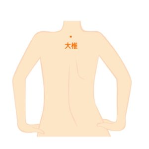 首筋の襟があたる部分で、1番骨が出ている部分の下のキワにある”大椎”全身を温めることができるツボで、全身を温め、首や肩のこりをやわらげる効果があるといわれています。
