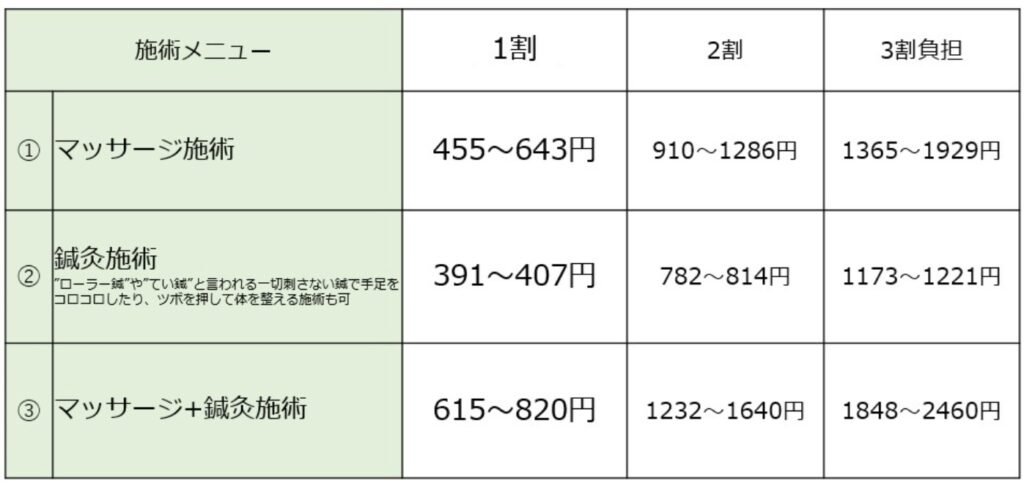 5部位のマッサージのみを受ける場合はおよそ455円(一割負担の方)