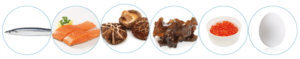 サケ、ウナギ、サンマ、メカジキ、イサキ、カレイ、シイタケ、キクラゲ、卵など