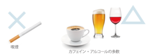 スナック菓子、インスタント食品の頻繁な摂取、アルコールの多飲、カフェインを多く含むコーヒーの多飲、タバコ